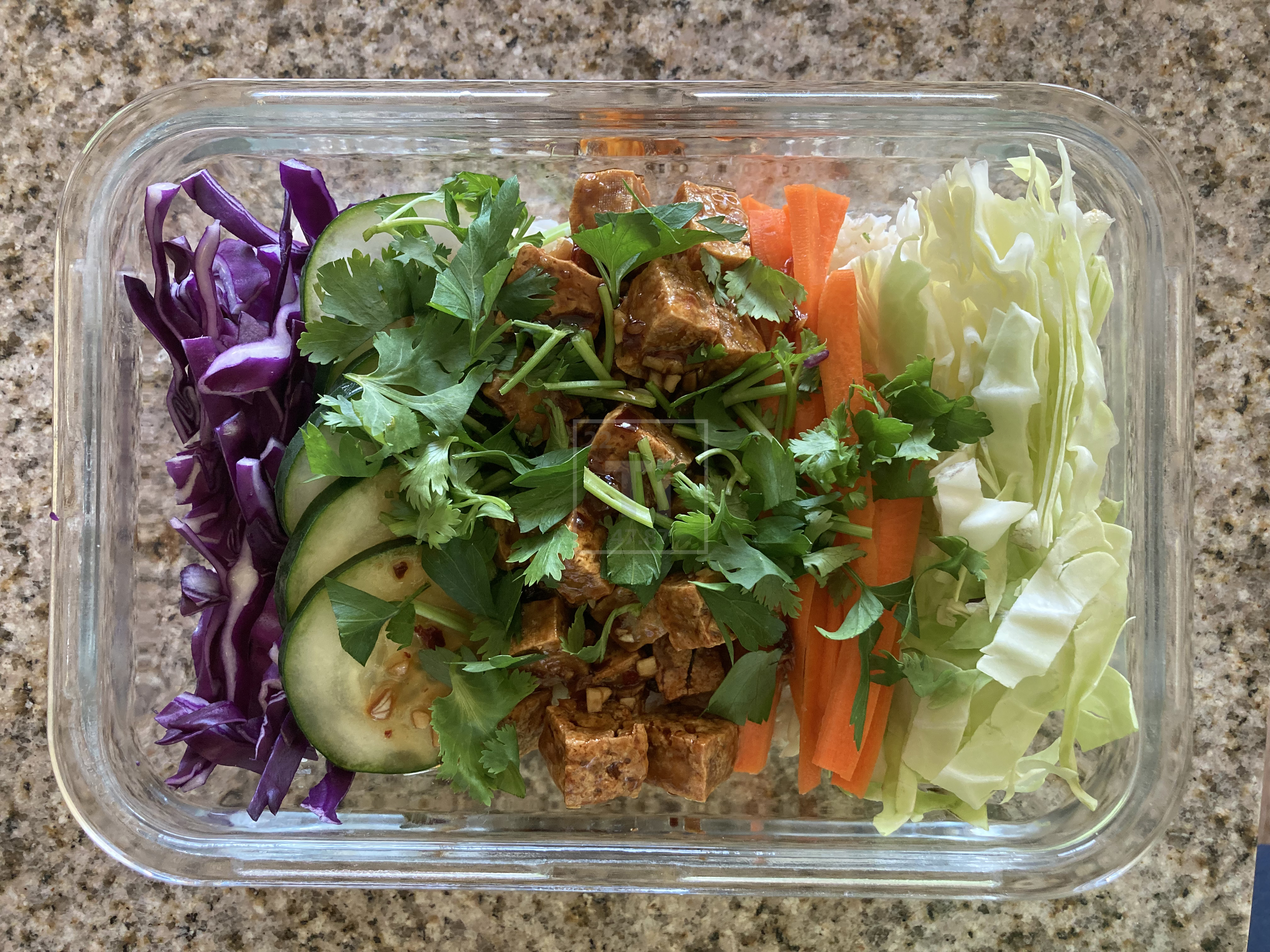 Plating in a glass tupperware, we have a vegan “tofu poke bento”. Check out the recipe here!
