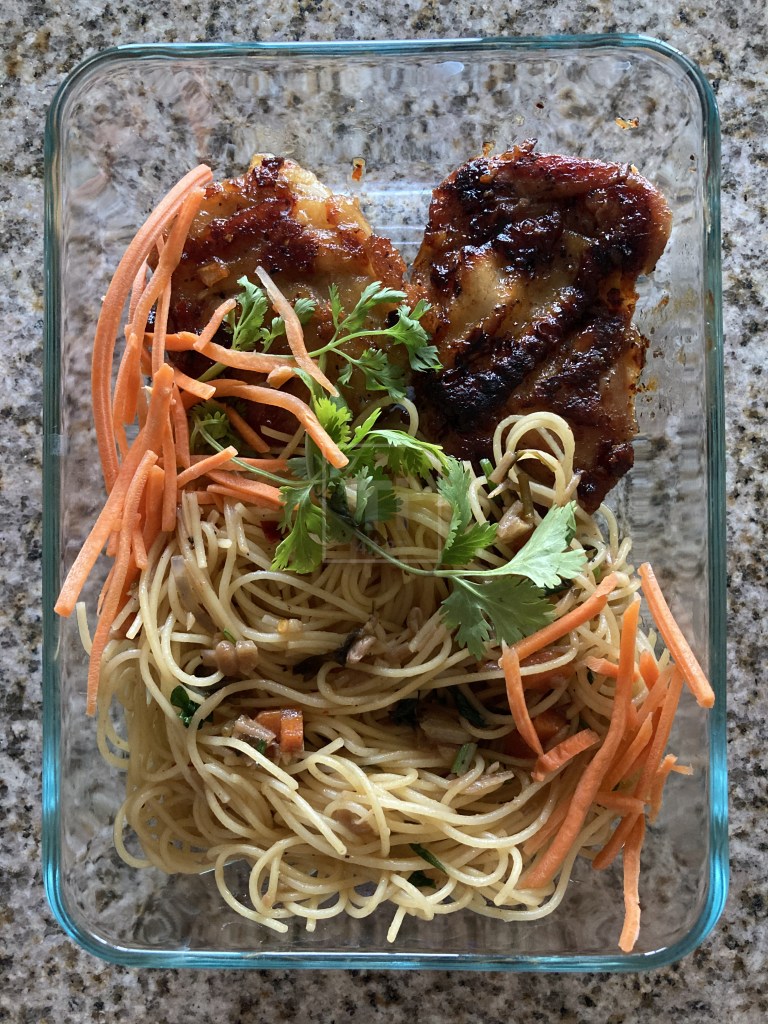 - Once the chicken is fully cooked, set them aside. In the same frying pan, save the excess oil on top for fried rice or any stir-fry recipes and keep the sauce at the bottom. Increase the heat to medium-high heat, add the remaining marinade to the frying pan to combine with the sauce, stir well until the liquid is reduced to 2/3 or 1/2 of the original amount. Mix the tapioca flour with water then quickly add to the sauce and constantly stirring until the sauce is thickened. Add the chicken thighs to the pan again and coat well with the sauce for 5-10 minutes. Then, turn off the heat and it’s ready to be served. Top with chopped cilantro and green onions.