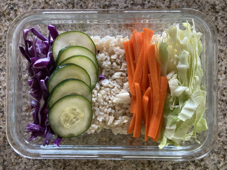 - Cho dưa leo đã thái lát, cà rốt và hai loại bắp cải đã thái sợi lên mặt cơm