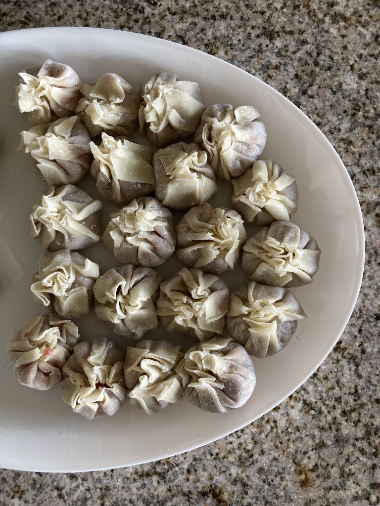 - Boil the dumplings in water until the wonton sheets became translucent (and the dumplings will be floating in water, take about 10 minutes since the water starts boiling). Take out the boiled dumplings and add to a dinner bowl (6 inches in diameter). (This step can be done while boiling the broth)