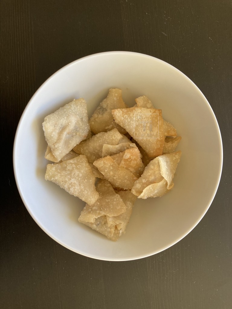 - Place a wonton sheet on a flat surface. Use a dinner spoon and add 1 spoonful of filling to the center of the wonton sheet, brush the edge with cooking oil and shape the wonton into an envelop by folding two pairs of opposite corners together (see photo on the right for better visualization). Repeat until finishing all the filling and wonton wraps. Then fry these “envelop” dumplings (340 F, 5-10 minutes) till slightly yellow (flat face up, corner face down) to keep the shape of the wonton. Don’t forget to remove excess oil with paper towel so that the dumplings are crispy.