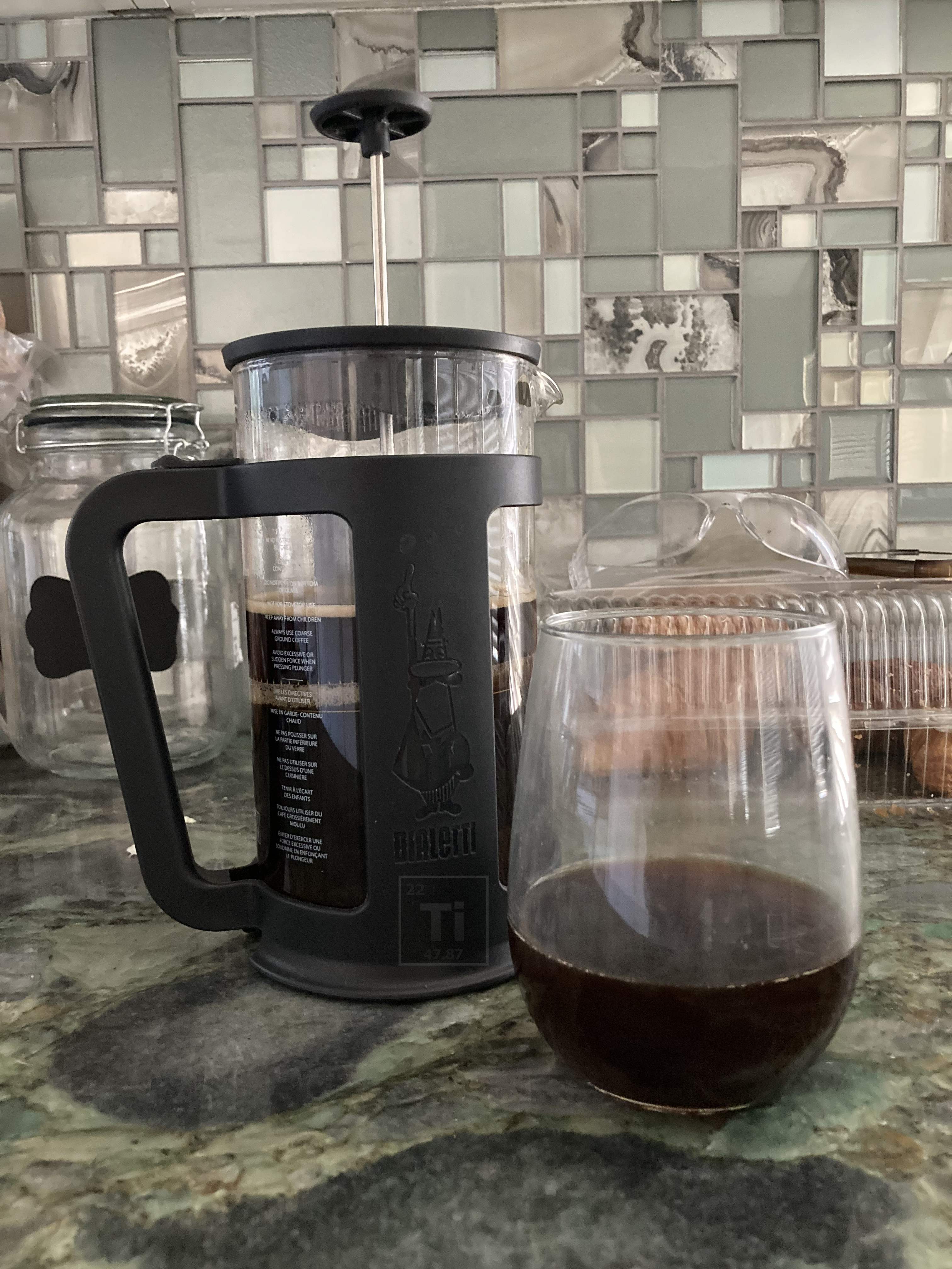 • In a 1-Liter French press (a standard 8-cup size): Add the ground coffee into the French press, then pour ~ 250 mL of boiling water till the coffee is just immersed in the water. Let it sit (with lid covered) for 5-10 minutes. Then, remove the lid and pour the boiling water to the maximum line of your French press, cover with lid and let it brew till serving. When serving, gently press down the mesh and pour the beautiful coffee into your favorite cup. Add creamer, sweetener and ice to taste.
