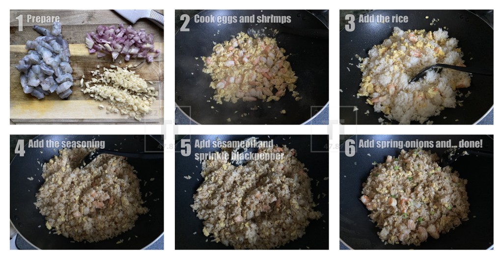 - Turn off the heat, add sesame oil and sprinkle some ground black pepper on top, make a quick mix and the shrimp egg fried rice is ready to be served.