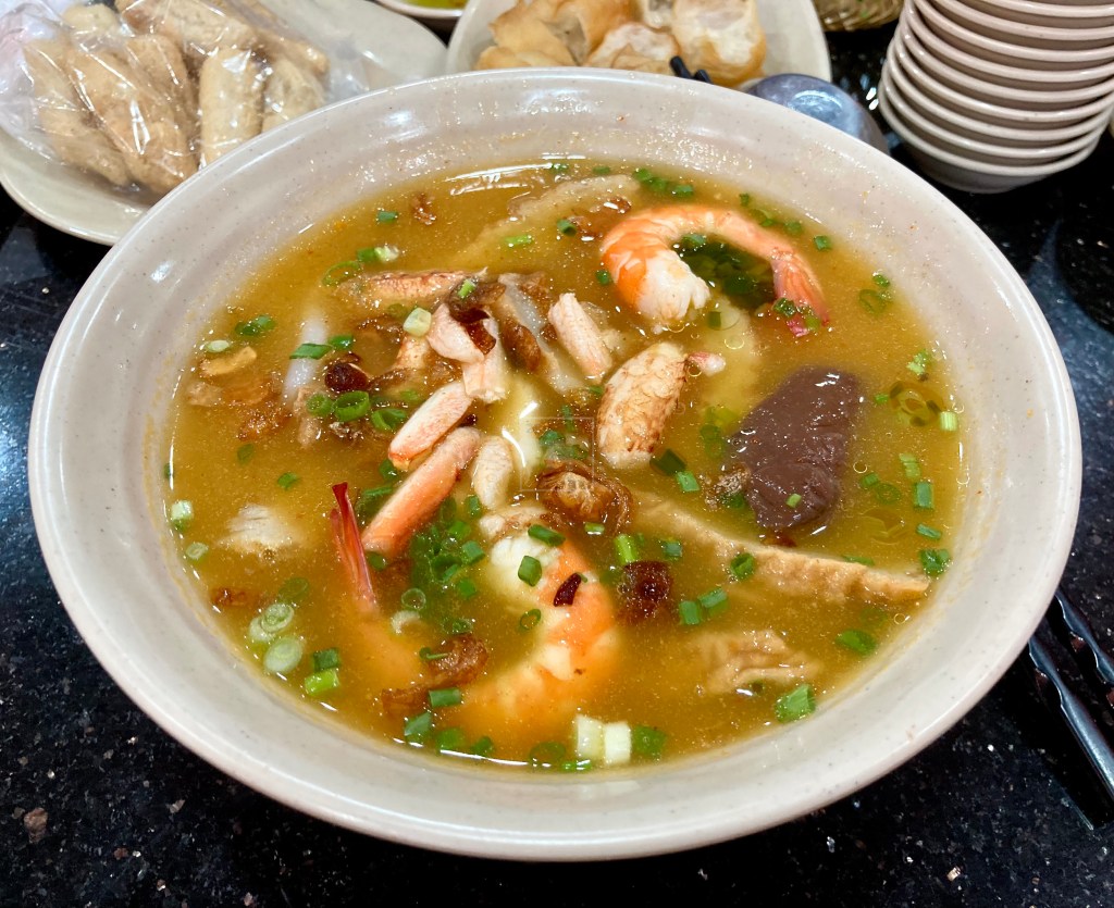 Another savory soup that I crave for is this Vietnamese crab udon soup, or so called “Bánh canh cua”. The noodle shape is similar to udon but it is made of rice flour and tapioca flour, cooked till soften then added to the broth, so we called it “bánh canh”. The broth was basically pork bone broth, with aroma from cilantro roots and onions, poured over “bánh canh” and crab meat on top. Garnish with spring onions and fried shallot, boom, we have an amazing bowl of Vietnamese crab udon soup! Or just go to this shop, they have it all! Just sit down and enjoy!