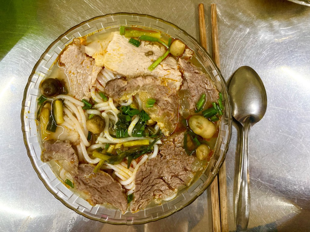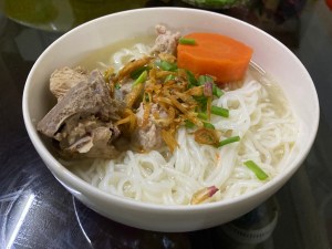 In this kind of soup, the broth was prepared by simmering pork bones and vegetables (carrots and white radish) for hours; ground pork was shaped into small (viên mọc) , then added to the broth, followed by seasoning. The hot broth was then poured into the rice noodle bowl, followed by adding pork balls, veggies, and some time short pork ribs. Topped with fried shallot and spring onions, we now have a yummy and savory bowl!