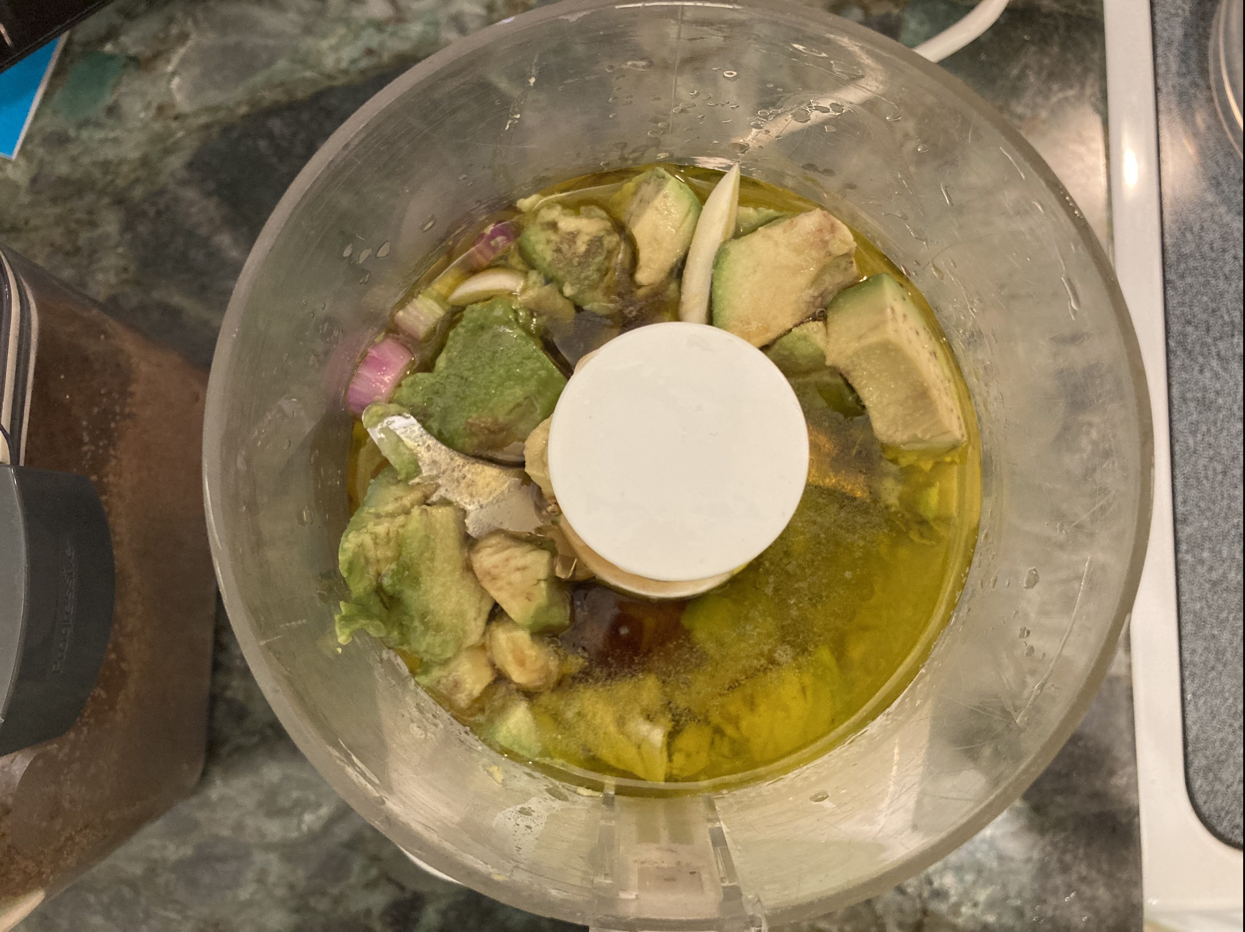 - Now it’s time to prepare our dressing! In a blender or food processor, combine the avocado, olive oil, apple cider vinegar, mesquite honey, lime juice, chopped garlic and shallot, with a pinch of salt. Blend until smooth and creamy.