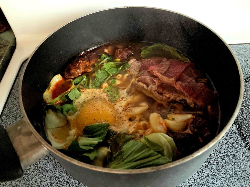 Left: with thin-sliced beef, egg and bok choy;