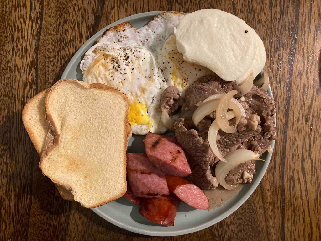 “Bánh mì chảo” is easy to prepared anywhere and we can you any types of bread we want. I recreated mine, including fried eggs, fresh cheese, stir-fried marinated beef and sausage, served with toasted bread. I’m thinking of making other version of “Bánh mì chảo” soon, like the meat balls.