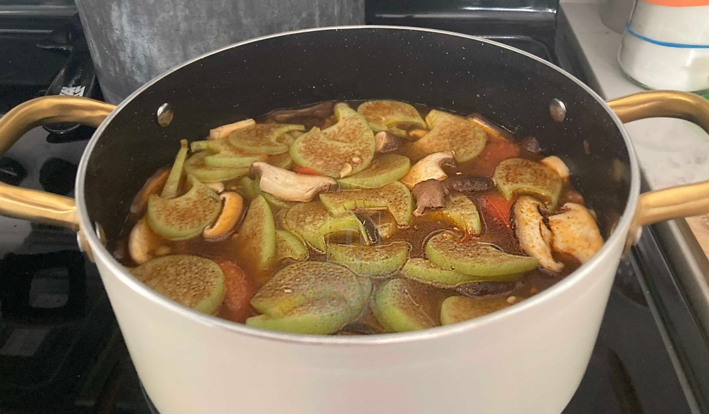 - Add in the vegetable stock. When the broth is boiling, reduce the heat to medium and add in the vegetables (except for the culantro and bean sprouts) as well as the seasoning above (tamarind paste, salt, sugar, mushroom bouillon powder).