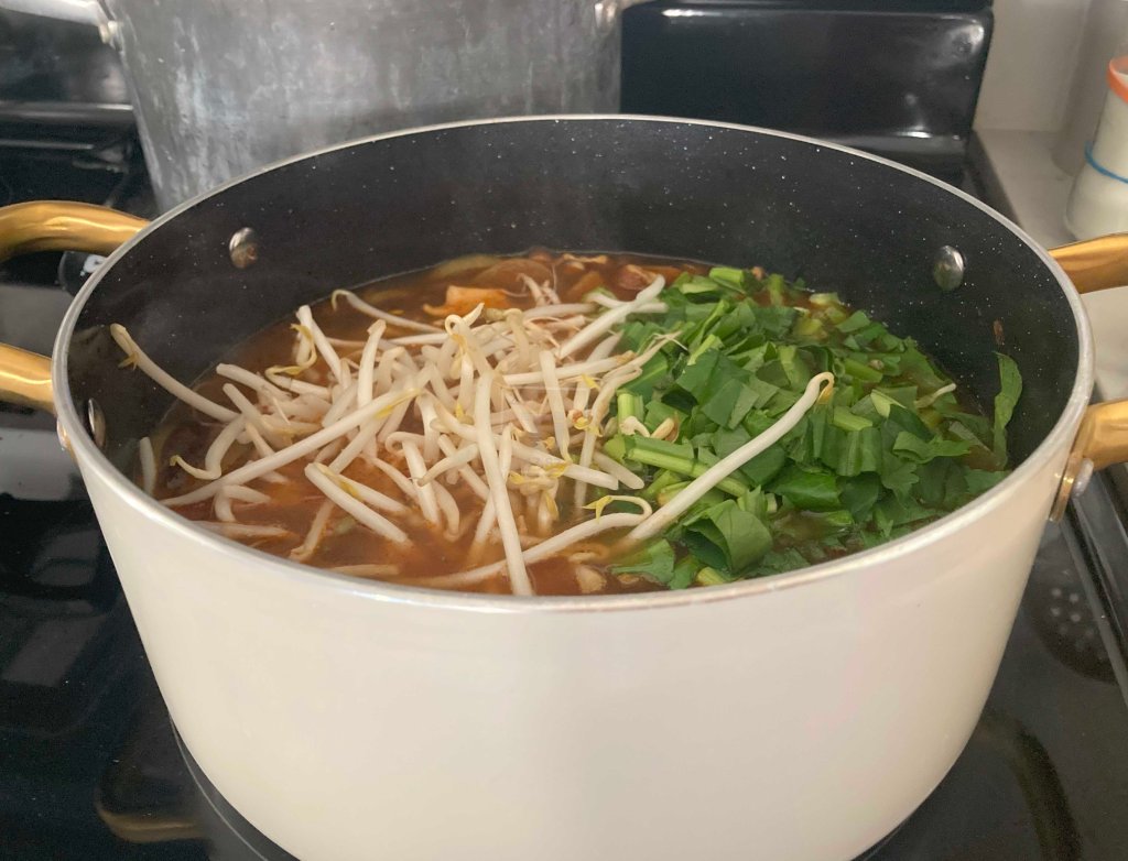 - When the soup is boiling back, turn off the heat and add in the chopped culantro and bean sprouts so the texture and color can be preserved.